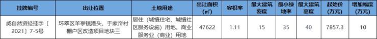 本次出让羊亭仅有一块地块,为环翠区羊亭镇港头、于家夼村棚户区改造项目地块三,出让面积为47622平方米, 起拍总价约7857.3万元,楼面起价1486.42元/平,详情如下: