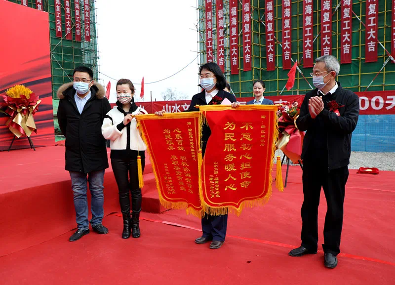 复工当日,不少业主从全国各地赶到威海,见证山水家园·福海项目复工时刻。在仪式现场,1号楼业主张利不停地将现场照片和视频发到微信群里,业主们留言,“这是一个流泪的时刻。”