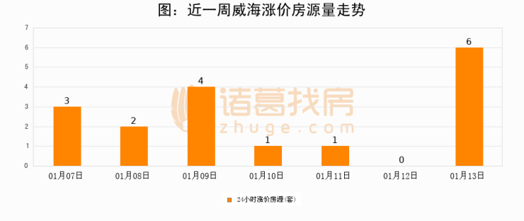 根据诸葛找房数据显示,威海24小时涨价房源量为6套,较01月12日增加6套,环比上涨0%。与此同时,涨价房源占比小幅扩大,业主信心有所提升。