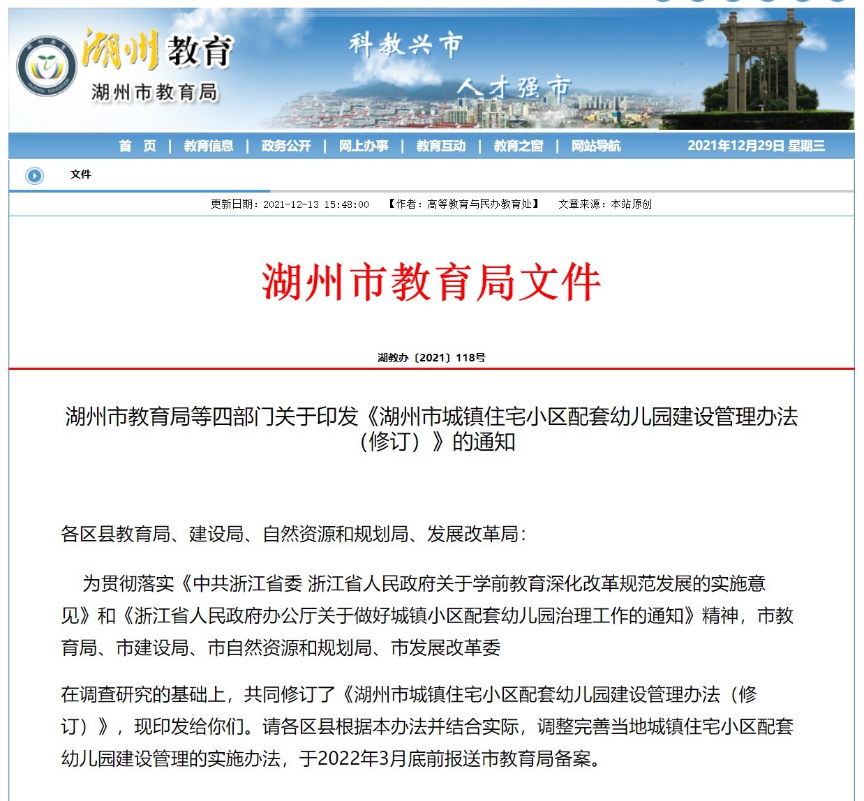 12月29日,澎湃新闻从浙江省湖州市教育局网站获悉,近日,湖州市教育局联合湖州市住房和城乡建设局等四部门印发《湖州市城镇住宅小区配套幼儿园建设管理办法(修订)》的通知(简称《通知》)。