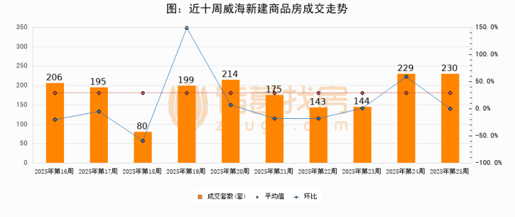 进入2025年第25周(06月16日-06月22日),威海新建商品房成交230套,较上周增加1套,环比上涨0.4%