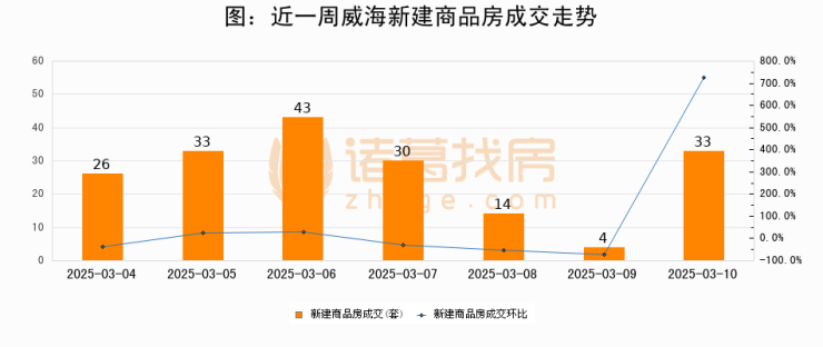 根据威海市住房和城乡建设局数据显示,2025年03月10日威海新建商品房成交33套,较昨日增加29套,环比上涨725%。近一周威海新建商品房日均成交27套。03月10日单日成交33套,高于近一周平均水平22.2%。