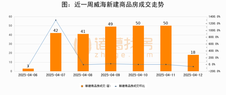 根据威海市住房和城乡建设局数据显示,2025年04月12日威海新建商品房成交18套,较昨日减少32套,环比下降64%