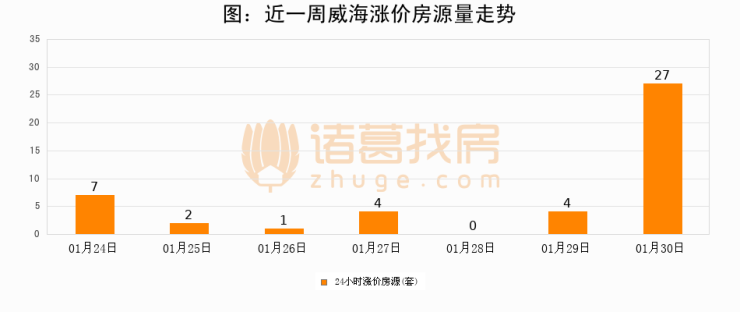 根据诸葛找房数据显示,威海24小时涨价房源量为27套,较01月29日增加23套,环比上涨575%。与此同时,涨价房源占比小幅扩大,业主信心有所提升。