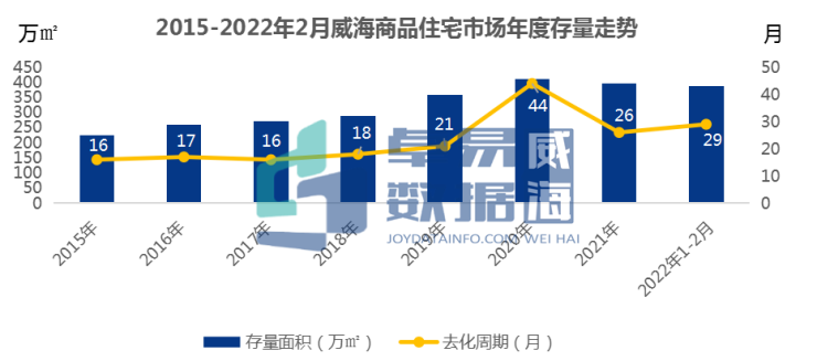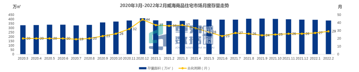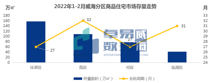截至2022年2月底,威海市商品住宅库存达386万㎡,去化周期维持29个月。库存集中于环翠区、高区、经区三大城区。