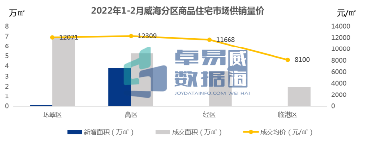 据卓易监测数据显示,2022年1-2月威海商品住宅市场供应面积3.86万㎡,成交1570套,销售面积17.72万㎡;成交均价11622元/㎡。1-2月仅环翠区和高区有新增供应,环翠区成交最多,占全市39%。