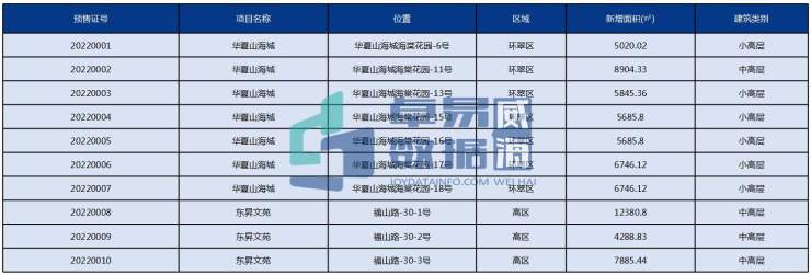 据卓易监测数据显示,2022年1-2月威海市住房和城乡建设局更新了17张预售证,涉及华夏山海城、东昇文苑、万科威高璞悦山、国信壹品南山、恒大悦澜庭、五渚河生态城、国宏立泰桂花园、慧园学府等8个项目。