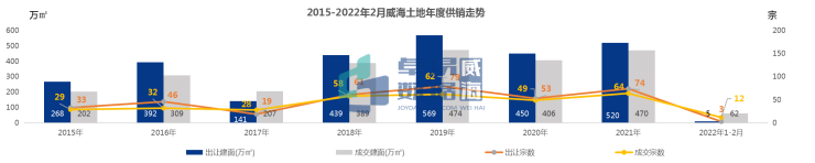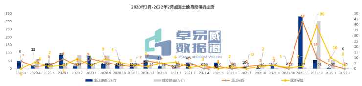 据卓易监测数据显示,继2021年末集中供地后,2022年威海土地市场开年供应骤减,1-2月市区仅出让3宗土地,总建面51310㎡,成交13宗,总建面621681㎡。