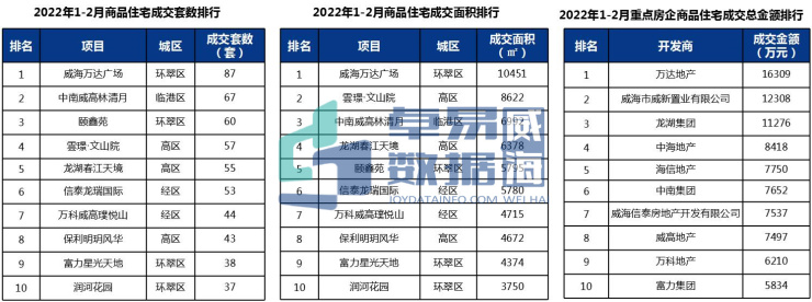 2022年1-2月,商品住宅成交套数top10环翠区占4席、高区占3席、经区占两席,临港区仅一个项目上榜;环翠区万达广场项目成交套数和成交面积均为较高,使得万达地产占据本月房企成交总金额排行榜首。