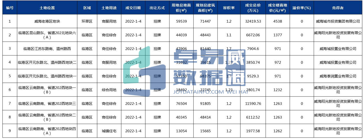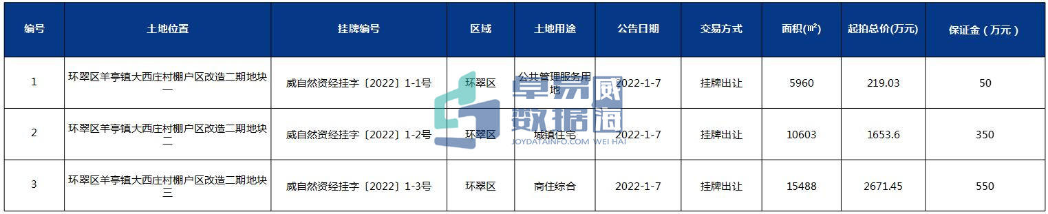 据卓易监测数据显示,2022年1-2月威海市区共计出让3宗土地,全部位于环翠区羊亭镇;