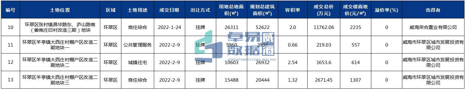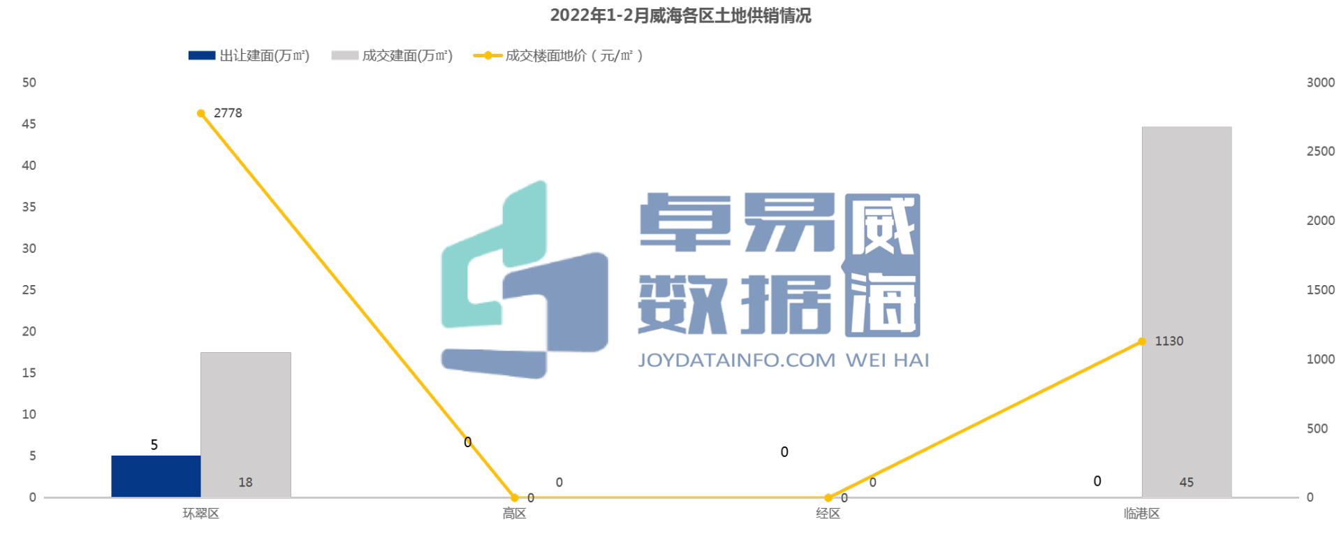 据卓易监测数据显示,2022年1-2月威海市区共计成交13宗土地,其中环翠区5宗、临港区8宗。