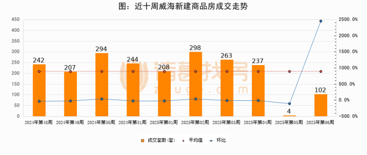 进入2025年第06周(02月03日-02月09日),威海新建商品房成交102套,较上周增加98套,环比上涨2450%