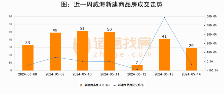 根据威海市住房和城乡建设局数据显示,2024年05月14日威海新建商品房成交29套,较昨日减少12套,环比下降29.3%