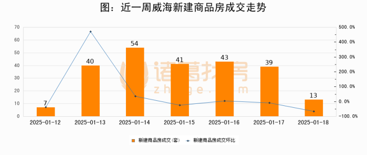 根据威海市住房和城乡建设局数据显示,2025年01月18日威海新建商品房成交13套,较昨日减少26套,环比下降66.7%