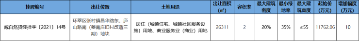 本次出让威自然资经挂字〔2021〕14号地块,为环翠区张村镇昌华路东、庐山路南(姜南庄旧村改造三期)地块,出让面积为26311平方米, 起拍总价约1.176亿元,楼面起价2235.20元/平。