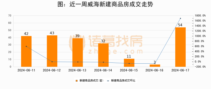 根据威海市住房和城乡建设局数据显示,2024年06月17日威海新建商品房成交54套,较昨日增加51套,环比上涨1700%