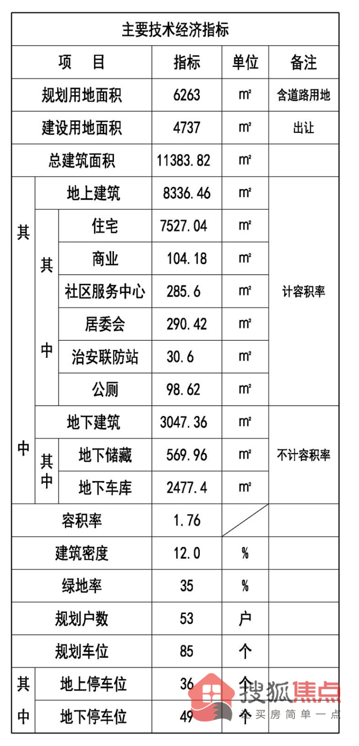 根据平面图所示,此项目容积率1.76,建筑密度12%,绿地率35%,规划户数53户,规划车位85个(地上36个、地下49个),其中住宅面积7527.04㎡,商业面积104.18平米,项目规划15F住宅楼,配套社区服务中心、居委会网点、治安联防站及公厕。