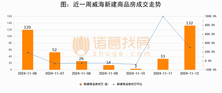 根据威海市住房和城乡建设局数据显示,2024年11月12日威海新建商品房成交132套,较昨日增加99套,环比上涨300%