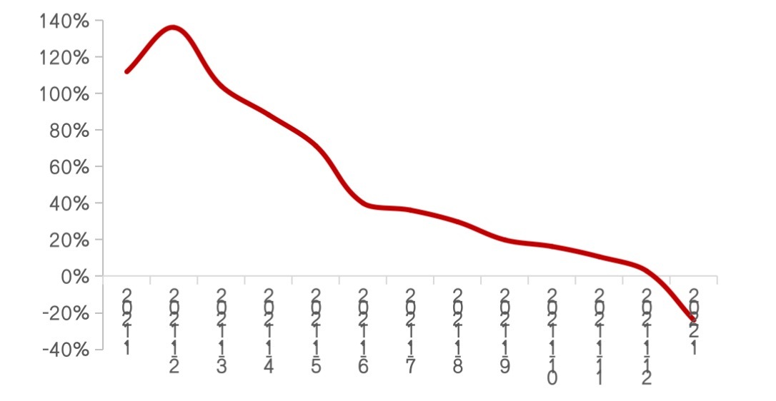 2021年-2022年1月TOP100房企增速情况 来源:中指研究院