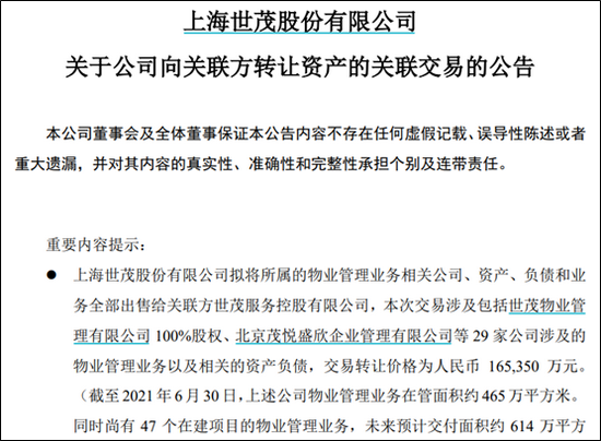 12月13日,世茂股份发布了关于公司向关联方转让资产的关联交易的公告,拟将所属的物业管理业务相关公司、资产、负债和业务全部出售给关联方世茂服务控股有限公司,此次交易涉及包括世茂物业管理有限公司100%股权、北京茂悦盛欣企业管理有限公司等29家公司涉及的物业管理业务以及相关的资产负债,交易转让价格为16.54亿元。