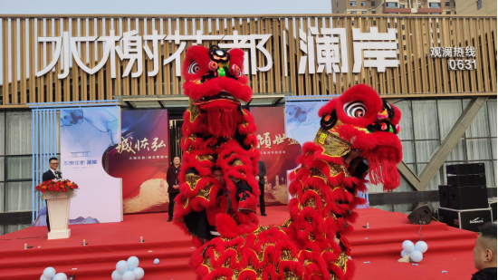 王总致辞完毕,五位嘉宾共同开启启动球,伴随着锣鼓声,舞狮队伍来到舞台中央,营销中心正式开放。
