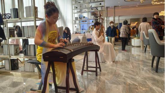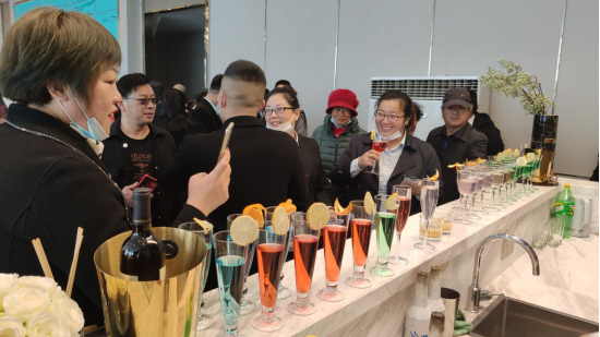 客户们有秩序的进入营销中心,售楼处内精心准备了调酒师现场表演、古香古色的琵琶、古琴弹奏还有精美冷餐供来访者品尝。