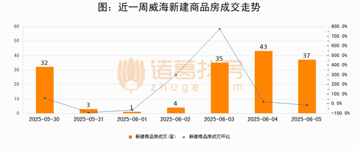 根据威海市住房和城乡建设局数据显示,2025年06月05日威海新建商品房成交37套,较昨日减少6套,环比下降14%