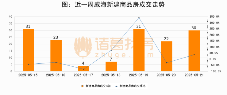 根据威海市住房和城乡建设局数据显示,2025年05月21日威海新建商品房成交30套,较昨日增加8套,环比上涨36.4%。近一周威海新建商品房日均成交22套。05月21日单日成交30套,高于近一周平均水平36.4%。