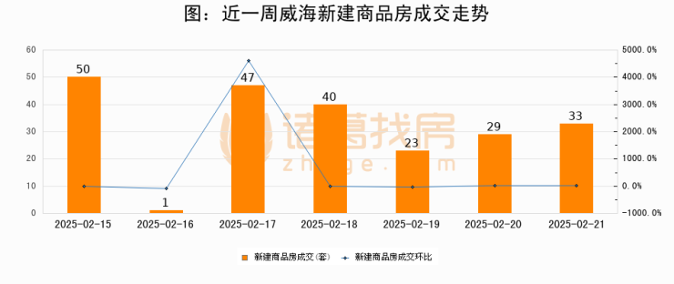 根据威海市住房和城乡建设局数据显示,2025年02月21日威海新建商品房成交33套,较昨日增加4套,环比上涨13.8%。近一周威海新建商品房日均成交32套。02月21日单日成交33套,高于近一周平均水平3.1%。