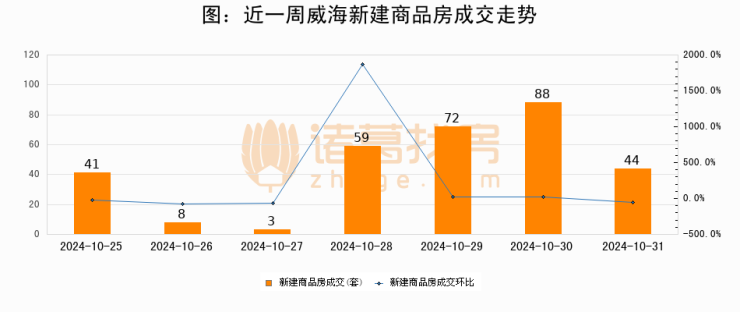 根据威海市住房和城乡建设局数据显示,2024年10月31日威海新建商品房成交44套,较昨日减少44套,环比下降50%。近一周威海新建商品房日均成交45套。10月31日单日成交44套,低于近一周平均水平2.2%。