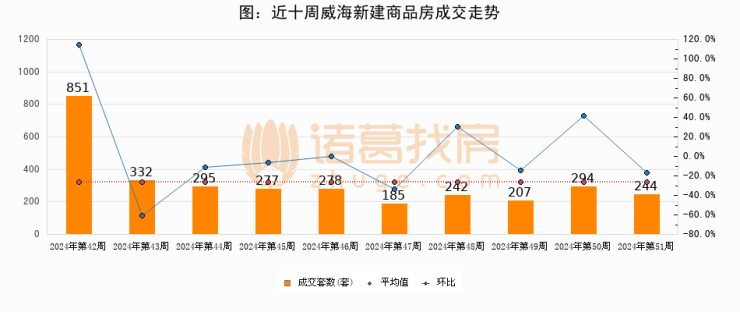 进入2024年第51周(12月16日-12月22日),威海新建商品房成交244套,较上周减少50套,环比下降17%