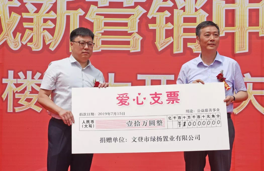 作为一个有社会责任感的企业,在市场经济追求合理利润的同时,更应承担社会责任,积极回报社会。致辞结束后,张明东董事长上台与文登天福街道办领导一起在台上进行爱心款捐赠交接仪式 ,绿扬置业捐赠的人民币10万元整,由文登区天福街道办进行捐赠交接,此笔慈善捐助款将由文登市天福街道办代收,将投入到公益慈善事业之中。