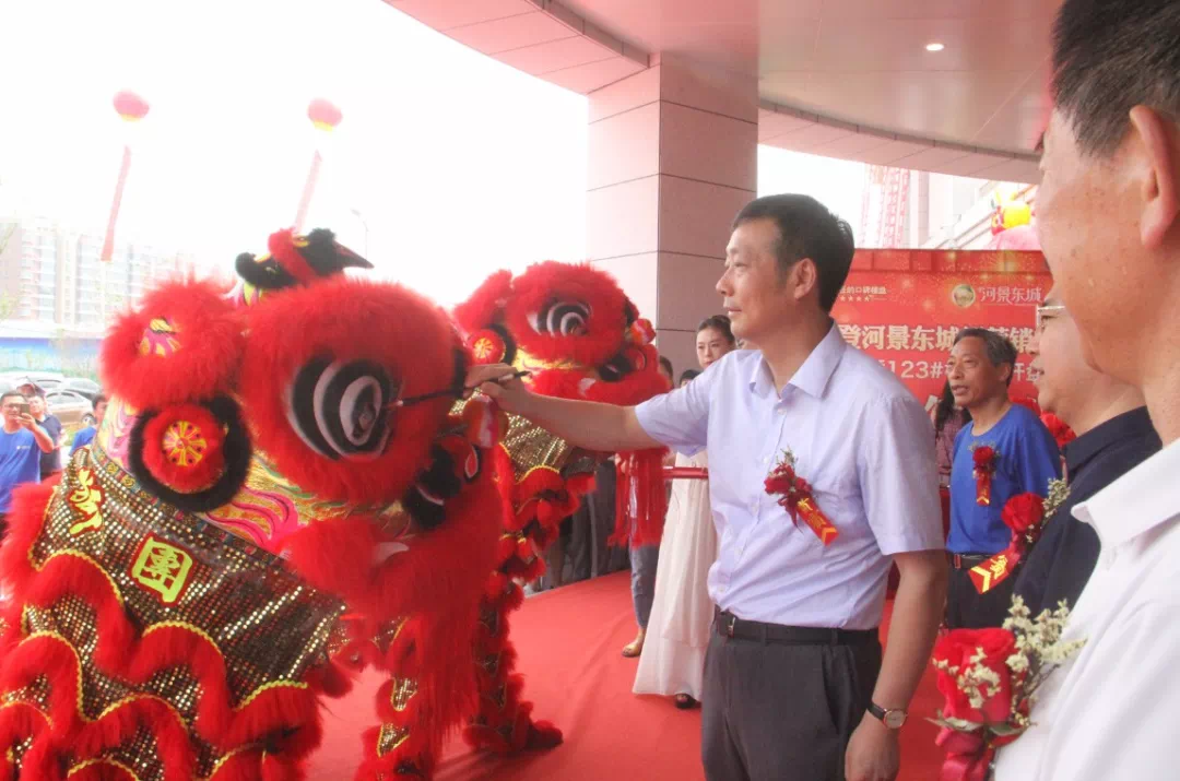 上午10:18,在精武舞狮精彩绝伦的表演氛围中,河景东城新营销中心荣耀开放的剪彩仪式正式开始,张明东董事长亲手为醒狮点睛,之后张明东董事长携一众贵宾一起移步营销中心门前,共同为新营销中心启用剪彩。