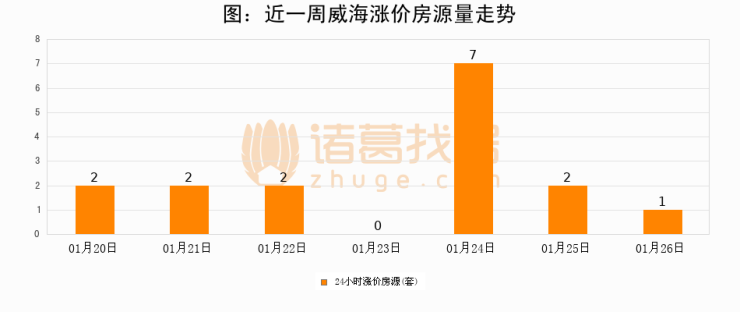 根据诸葛找房数据显示,威海24小时涨价房源量为1套,较01月25日减少1套,环比下降50%。与此同时,涨价房源占比小幅回落,对于购房者来说是一个入市窗口期,购房者可抓住时机入市。