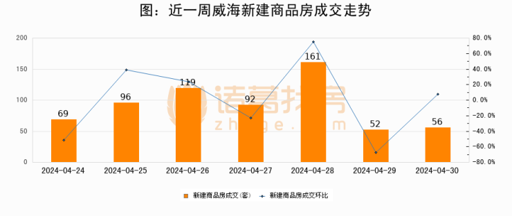 根据威海市住房和城乡建设局数据显示,2024年04月30日威海新建商品房成交56套,较昨日增加4套,环比上涨7.7%。近一周威海新建商品房日均成交93套。04月30日单日成交56套,低于近一周平均水平39.8%。