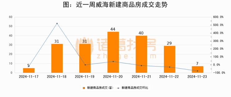 根据威海市住房和城乡建设局数据显示,2024年11月23日威海新建商品房成交7套,较昨日减少22套,环比下降75.9%