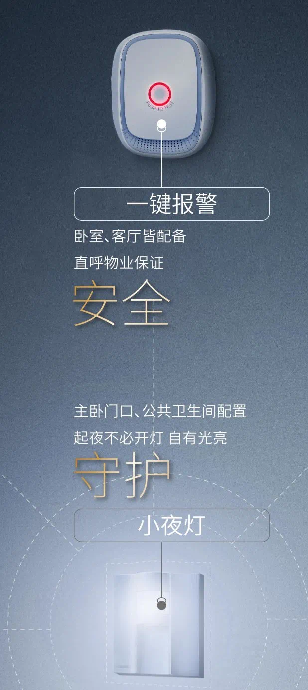 入户四合一智能门锁,带来安全便捷归家体验;全屋收纳系统,让空间扩容,美观同时增加收纳性;一键灯控细节,给您最省心的居家时光;厨房电器严选国际一线品牌,实用更放心,且通过吊轨推拉门、台下盆等人性设计,让厨房打扫更简单;卫生间洗漱台配置镜柜、化妆灯,细节之处彰显精致生活。