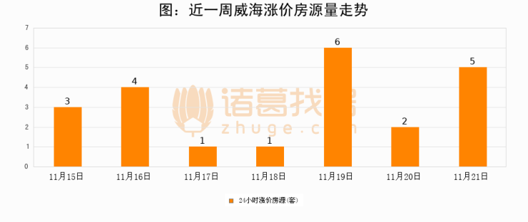 根据诸葛找房数据显示,威海24小时涨价房源量为5套,较11月20日增加3套,环比上涨150%。与此同时,涨价房源占比小幅扩大,业主信心有所提升。