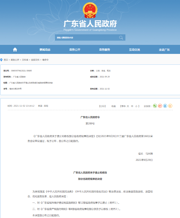 2021年11月2日,《广东省人民政府关于废止和修改部分省政府规章的决定》正式公布施行。其中提到,将对《广东省房产税施行细则》部分条款予以修改。