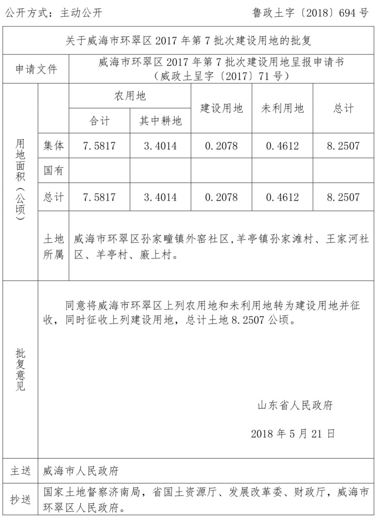近日,山东省国土资源厅公布了建设用地审批结果公告,其中涉及威海环翠区的1个社区、4个村,分别是威海市环翠区孙家疃镇外窑社区,羊亭镇孙家滩村、王家河社 区、羊亭村、廒上村。现同意将威海市环翠区上列农用地和未利用地转为建设用地并征 收,同时征收上列建设用地,总计土地 8.2507 公顷。