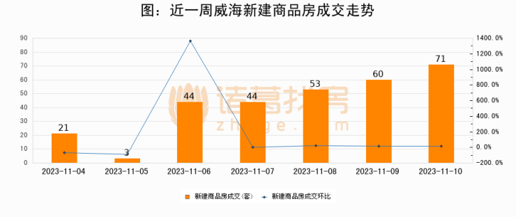 根据威海市住房和城乡建设局数据显示,2023年11月10日威海新建商品房成交71套,较昨日增加11套,环比上涨18.3%