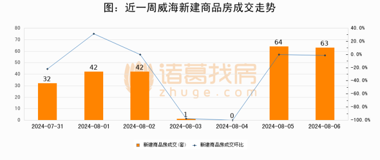 根据威海市住房和城乡建设局数据显示,2024年08月06日威海新建商品房成交63套,较昨日减少1套,环比下降1.6%