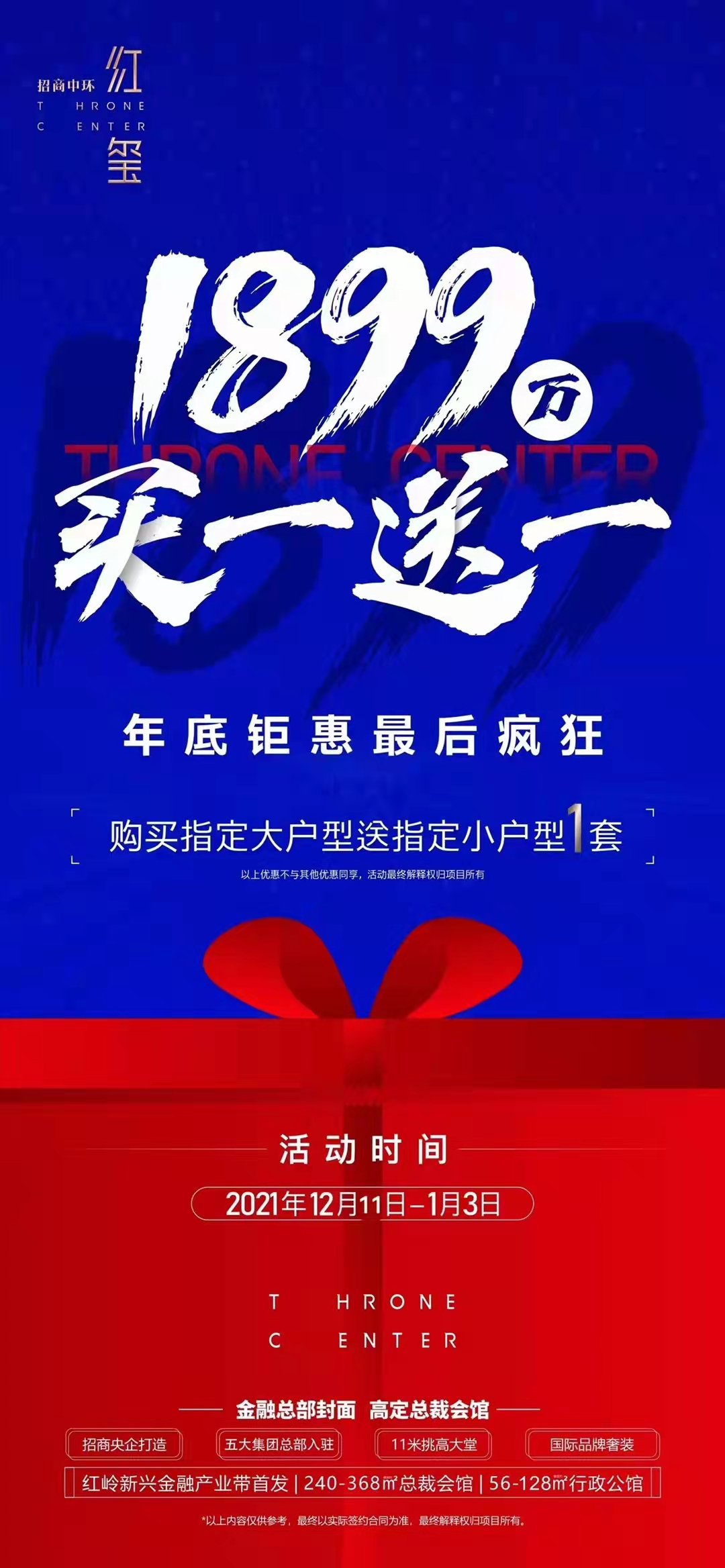 2021年12月11日-2022年1月3日,招商中环红玺推出“买一送一”活动。招商中环位于罗湖区,红岭北路与梅园路交汇处,项目总建筑面积约50万平方米,规划有约11万平方米公寓、约23万平方米写字楼、约5万平方米商业区。