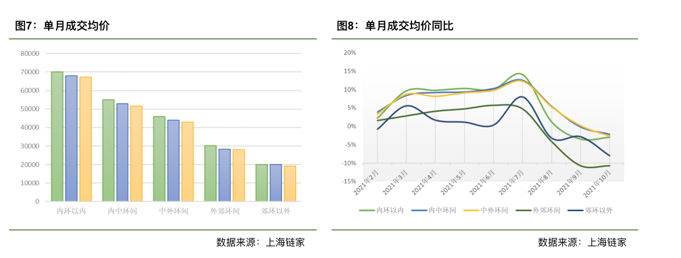 分环线的成交量来看,10月份各环线成交量的同比均出现不同程度下跌,且越靠近内环,同比跌幅越大。从占比来看,中外环间的占比略有增加,郊环以外继续下跌。
