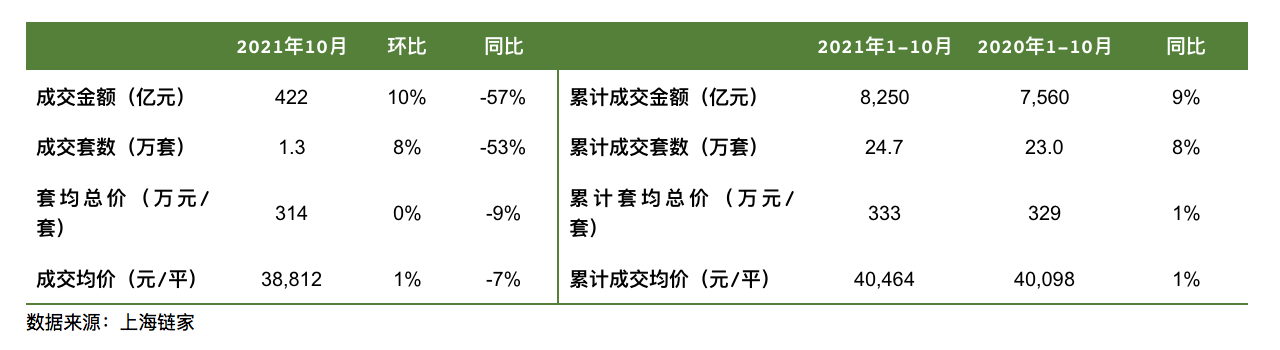综合看,2021年前10个月,上海全市二手房累计成交金额8250亿元,同比增长9%;成交套数24.7万套,同比增长8%;套均总价333万元/套,同比增长1%;成交均价40464元/平方米,同比增长1%。