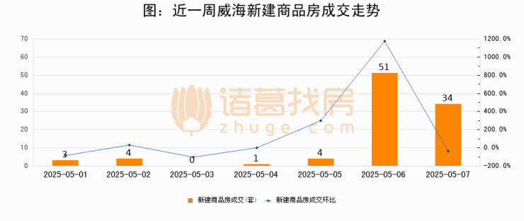 根据威海市住房和城乡建设局数据显示,2025年05月07日威海新建商品房成交34套,较昨日减少17套,环比下降33.3%。近一周威海新建商品房日均成交14套。05月07日单日成交34套,高于近一周平均水平142.9%。