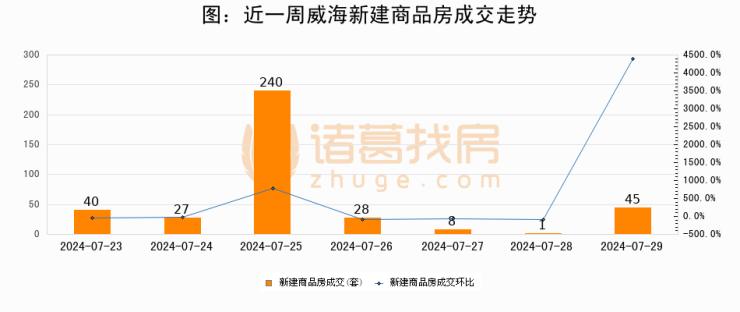 根据威海市住房和城乡建设局数据显示,2024年07月29日威海新建商品房成交45套,较昨日增加44套,环比上涨4400%