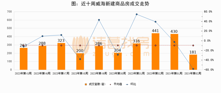 进入2024年第01周(01月01日-01月07日),威海新建商品房成交181套,较上周减少249套,环比下降57.9%