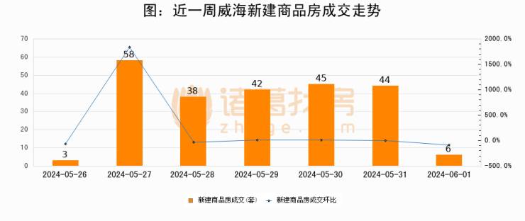 根据威海市住房和城乡建设局数据显示,2024年06月01日威海新建商品房成交6套,较昨日减少38套,环比下降86.4%