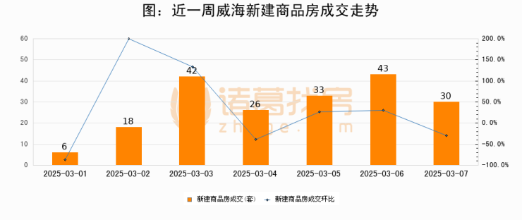 根据威海市住房和城乡建设局数据显示,2025年03月07日威海新建商品房成交30套,较昨日减少13套,环比下降30.2%。近一周威海新建商品房日均成交29套。03月07日单日成交30套,高于近一周平均水平3.4%。